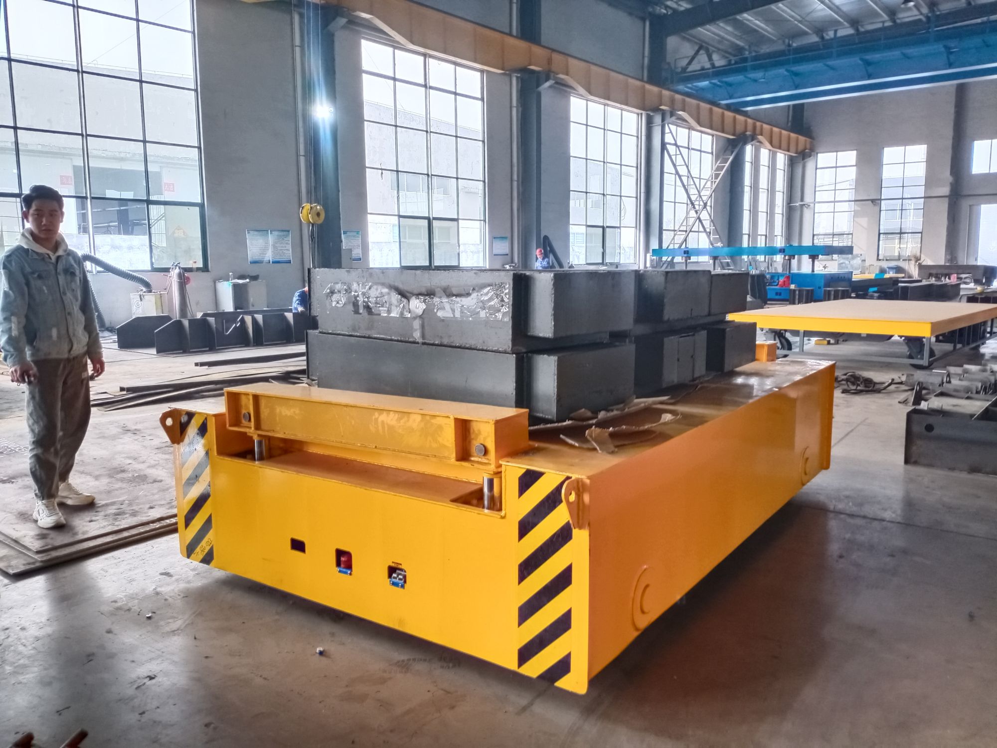 1.過(guò)跨軌道車(chē)、離地間隙550mm2.升降軌道車(chē),局部升降,升降高度150mm,提升梁同步誤差小于10mm,提升梁的升降為點(diǎn)動(dòng)操作(隨車(chē)線(xiàn)控按鈕+無(wú)線(xiàn)遙控器),提升梁油缸采用液壓鎖保壓,液壓站電機(jī)啟停隨提升梁升降操作。增加...
